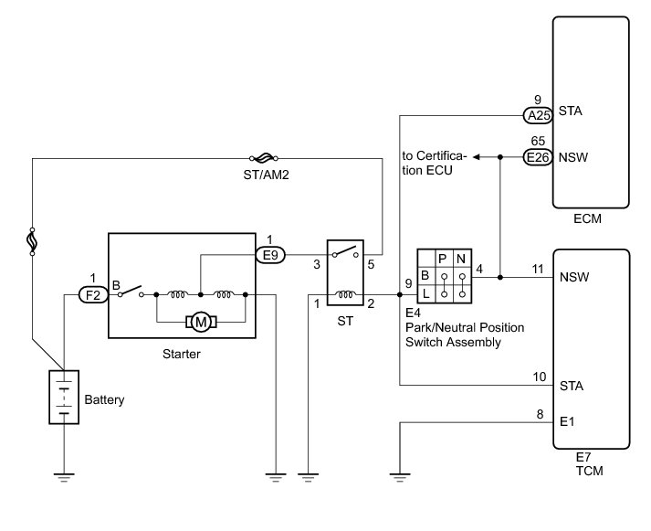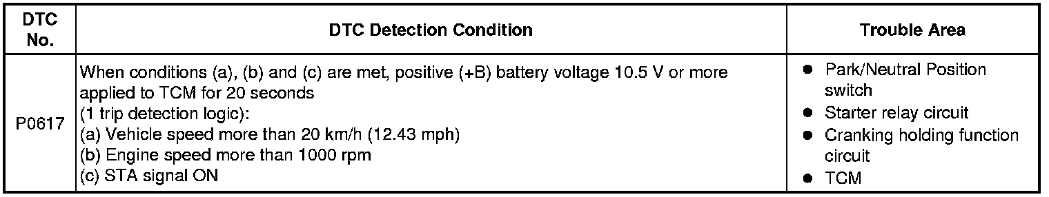 If the TCM detects the Starter Control (STA) signal while the vehicle is being driven, it determines that there is a malfunction in the STA circuit. The TCM then illuminates the MIL and sets the DTC.