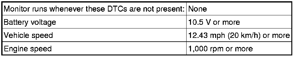 This monitor runs when the vehicle is driven at 20 km/h (12.43 mph) for over 20 seconds.