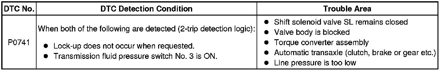 If the TCM detects no lock-up after lock-up has been requested or if it detects lock-up when it is not requested, the TCM interprets this as a fault in shift solenoid valve SL or lock-up system performance. The TCM will turn on the MIL and store the DTC.