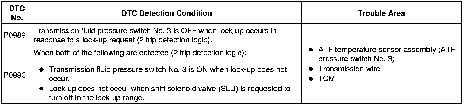 The TCM illuminates the MIL and stores the DTC when the TCM detects that the ATF pressure switch is OFF with the lock-up solenoid ON or when the TCM detects that the ATF pressure switch is ON with the lock-up solenoid OFF.