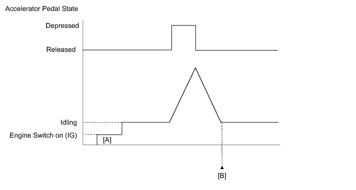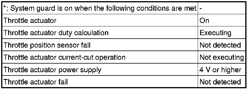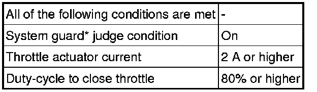 When any of these DTCs or other DTCs relating to Electronic Throttle Control System (ETCS) malfunctions are stored, the ECM enters fail-safe mode. During fail-safe mode, the ECM cuts the current to the throttle actuator, and the throttle valve is returned to a 6° throttle angle by the return spring. The ECM then adjusts the engine output by controlling the fuel injection (intermittent fuel-cut) and ignition timing, in accordance with the accelerator pedal angle, to allow the vehicle to continue at a minimal speed. If the accelerator pedal is depressed firmly and gently, the vehicle can be driven slowly.