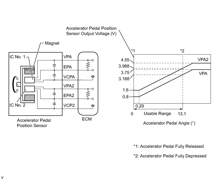 The accelerator pedal position sensor is built into the accelerator pedal sensor assembly and has 2 sensor circuits: VPA (main) and VPA2 (sub). This sensor is a non-contact type sensor and uses Hall-effect elements in order to yield accurate signals even in extreme driving conditions, such as at high speeds as well as very low speeds. The voltage, which is applied to terminals VPA and VPA2 of the ECM, varies between 0.5 V and 4.5 V in proportion to the operating angle of the accelerator pedal (throttle valve). A signal from VPA indicates the actual accelerator pedal opening angle (throttle valve opening angle) and is used for engine control. A signal from VPA2 conveys the status of the VPA circuit and is used to check the accelerator pedal position sensor itself.