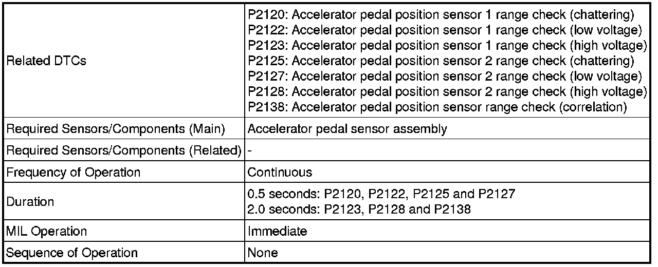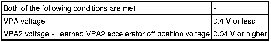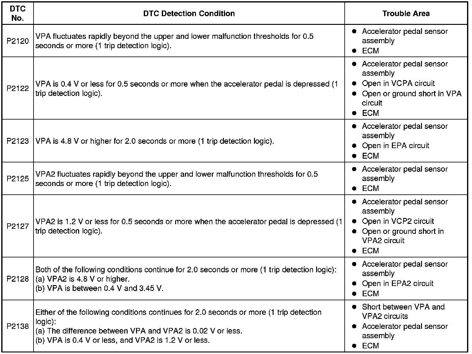 When the output voltage of VPA is less than 0.4 V for more than 0.5 seconds when the accelerator pedal is fully depressed, DTC P2122 is stored.