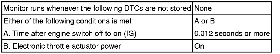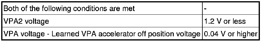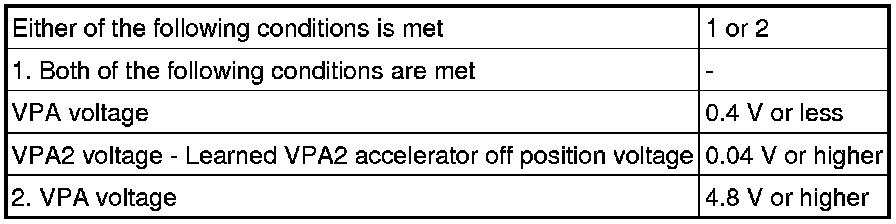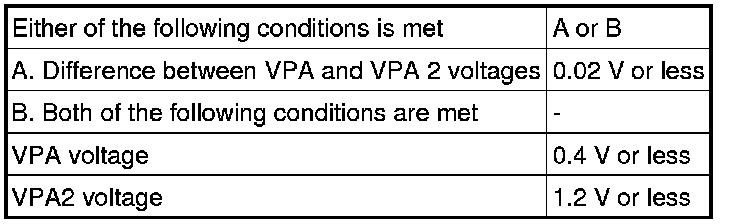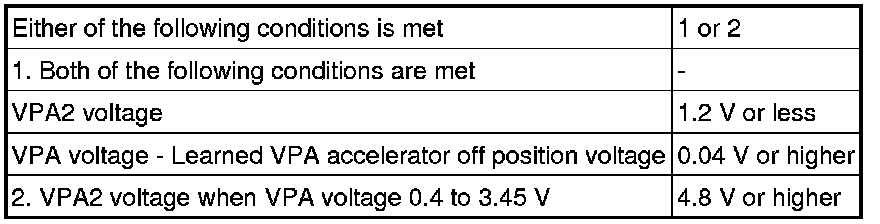 When either output voltage of VPA or VPA2 deviates from the standard range, or the difference between the output voltages of the 2 sensor circuits is more than the threshold, the ECM determines that there is a malfunction in the accelerator pedal position sensor. The ECM then illuminates the MIL and stores a DTC.