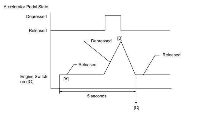 When DTC P2120, P2121, P2122, P2123, P2125, P2127, P2128 or P2138 is stored, the ECM enters fail-safe mode. If either of the 2 sensor circuits malfunctions, the ECM uses the remaining circuit to calculate the accelerator pedal position to allow the vehicle to continue driving. If both of the circuits malfunction, the ECM regards the accelerator pedal as being released. As a result, the throttle valve is closed and the engine idles.