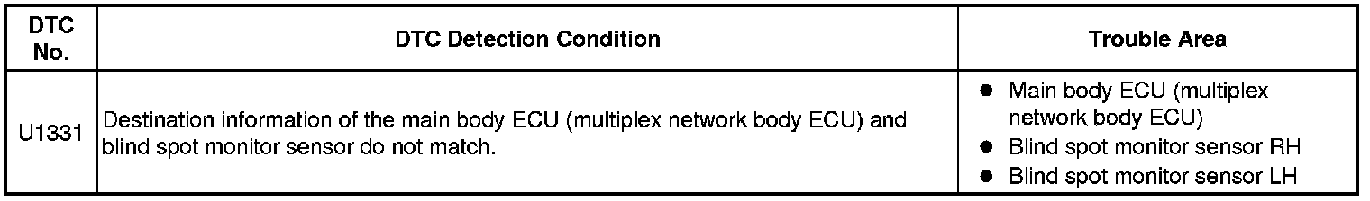 This DTC is stored when the destination information of the main body ECU (multiplex network body ECU) does not match that of the blind spot monitor sensors.