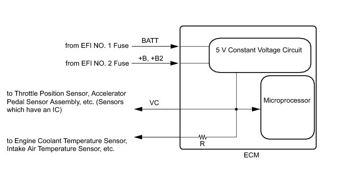 The ECM constantly generates 5 V power source voltage from the battery voltages supplied to the +B (BATT) terminal to operate the microprocessor. The ECM also provides this power to the sensors through the VC output circuit.