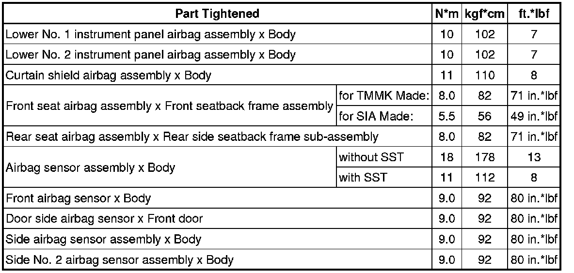 SPECIFICATIONS: SUPPLEMENTAL RESTRAINT SYSTEMS: TORQUE SPECIFICATIONS