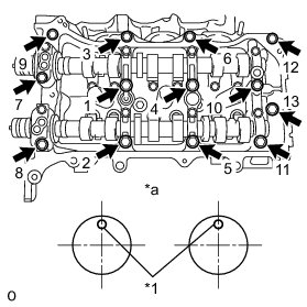 Install the camshaft housing sub-assembly LH and tighten the 13 bolts in the order shown in the illustration.