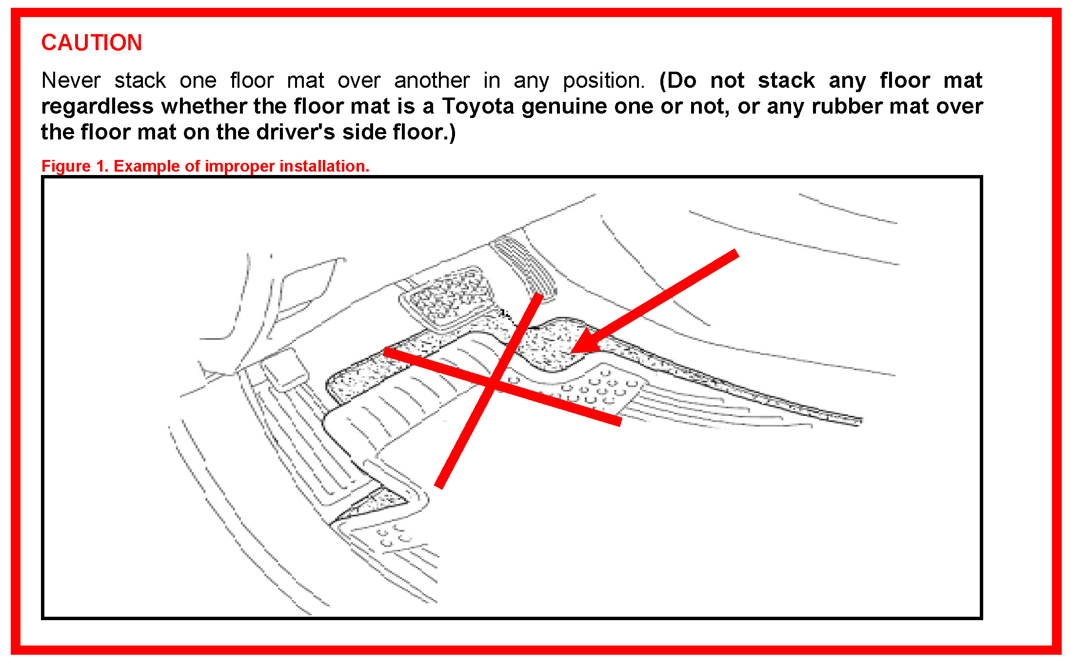 - Make sure the driver's side floor mat is properly placed on the vehicle carpet and secured with the retaining clips. If the driver side floor mat is NOT properly placed and secured, it could slip and interfere with the movement of the pedals during driving and may cause an accident.