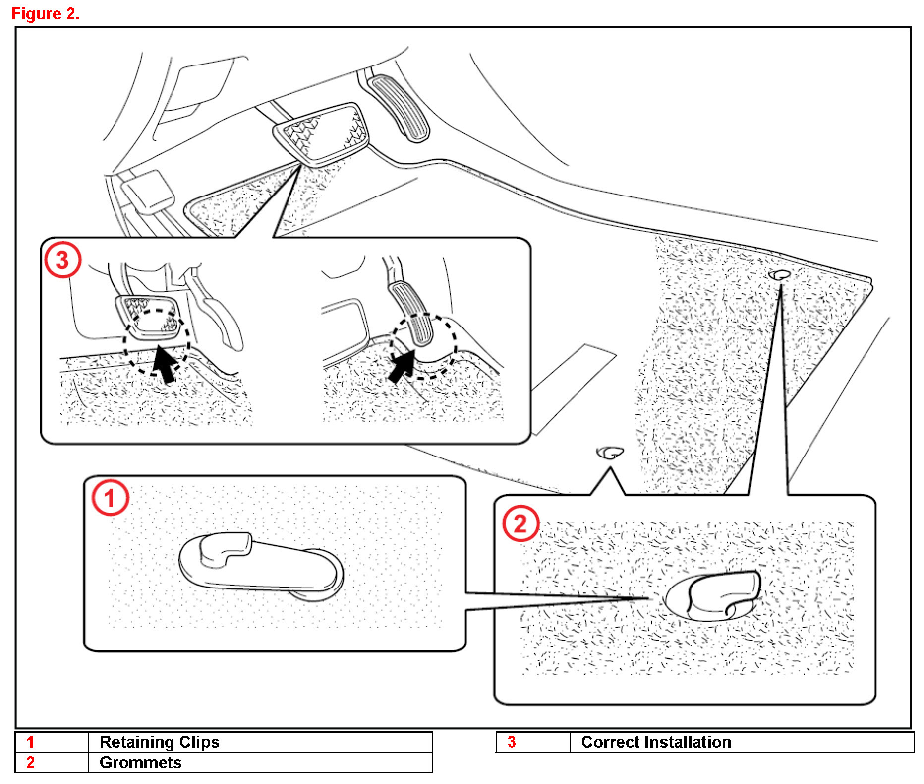 2. Attach the driver and passenger side (if applicable) floor mats to the vehicle carpet using the clips. Secure the mat by inserting the retaining clips through the grommet holes.