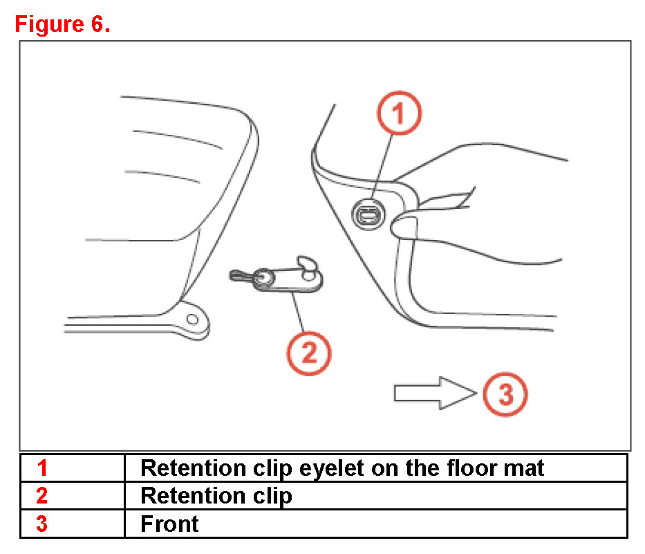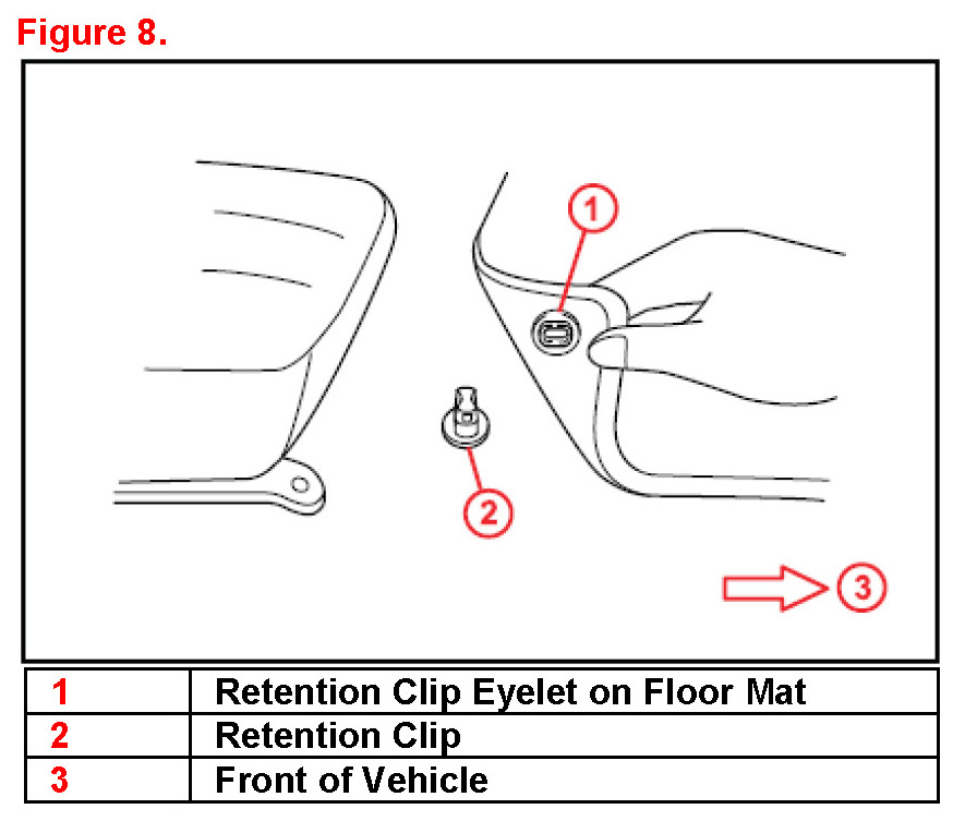 - 2011 and 2012 model year vehicles are equipped with several styles of driver's side floor mat retaining clips to secure the floor mat in the correct position. In addition, some models may utilize retaining clips for passenger's side floor mats as well.