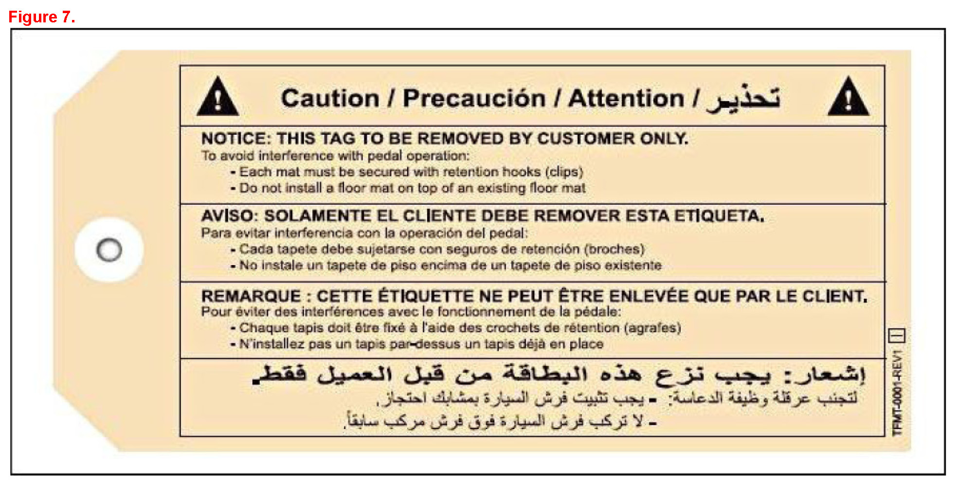 If applicable, DO NOT remove the beige "Caution" tag from the floor mat. This should only be removed by the customer.