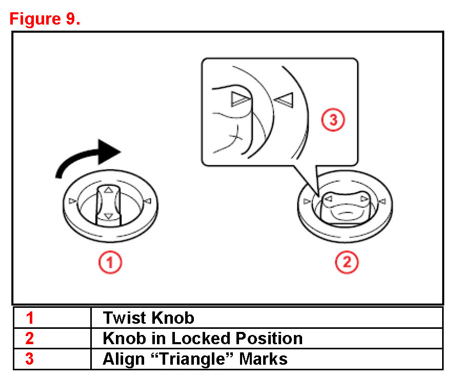 3. Turn the retention clip knobs a quarter of a turn to lock in place and verify the "triangle" marks on the retention clip knob and floor mat are aligned.
