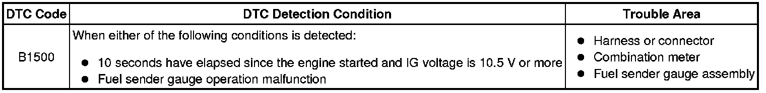 This DTC is output when the combination meter detects the fuel sender gauge malfunction via the direct line.