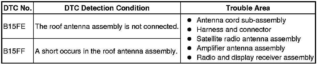 These DTCs are stored when a malfunction occurs in the roof antenna assembly which is connected to the radio and display receiver assembly.