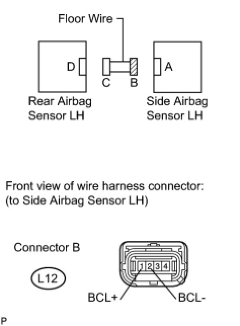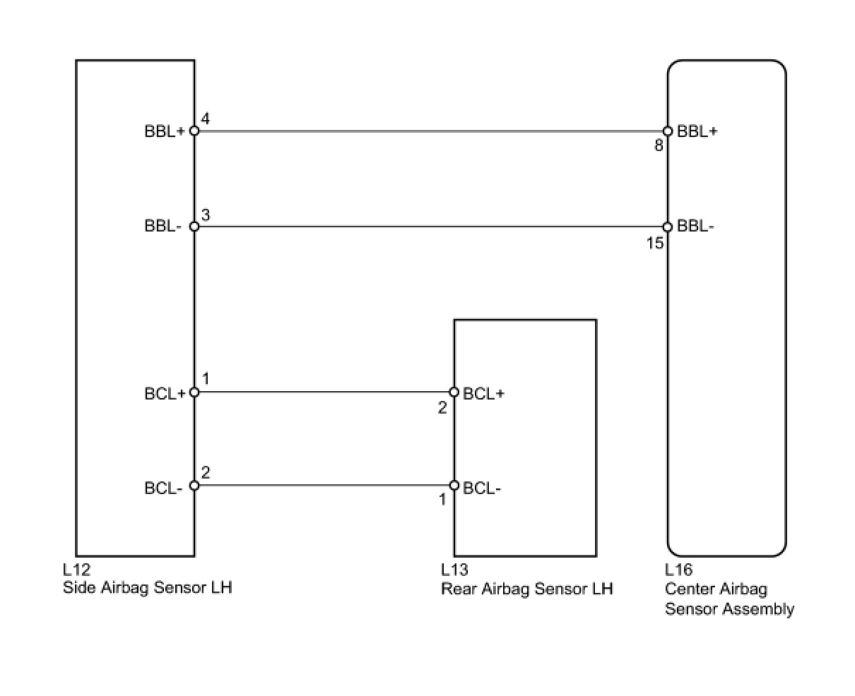 The rear airbag sensor LH circuit consists of the center airbag sensor assembly, rear airbag sensor LH, and side airbag sensor LH.