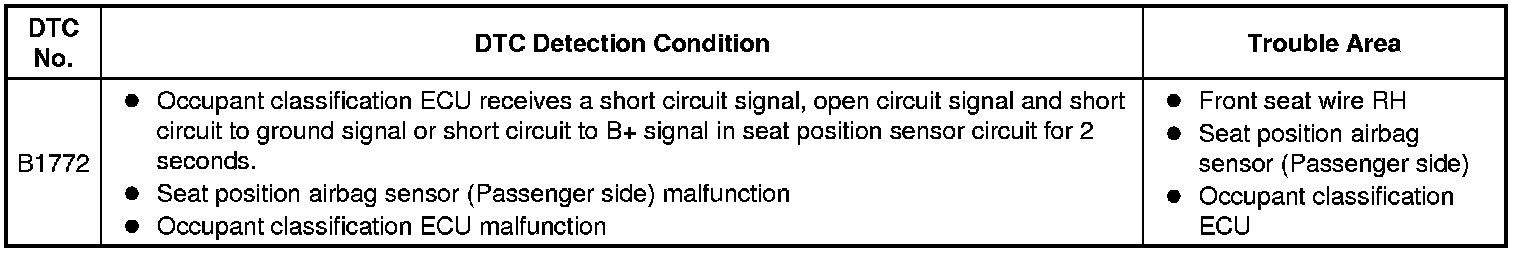 DTC B1772 is recorded when a malfunction is detected in the seat position sensor circuit.