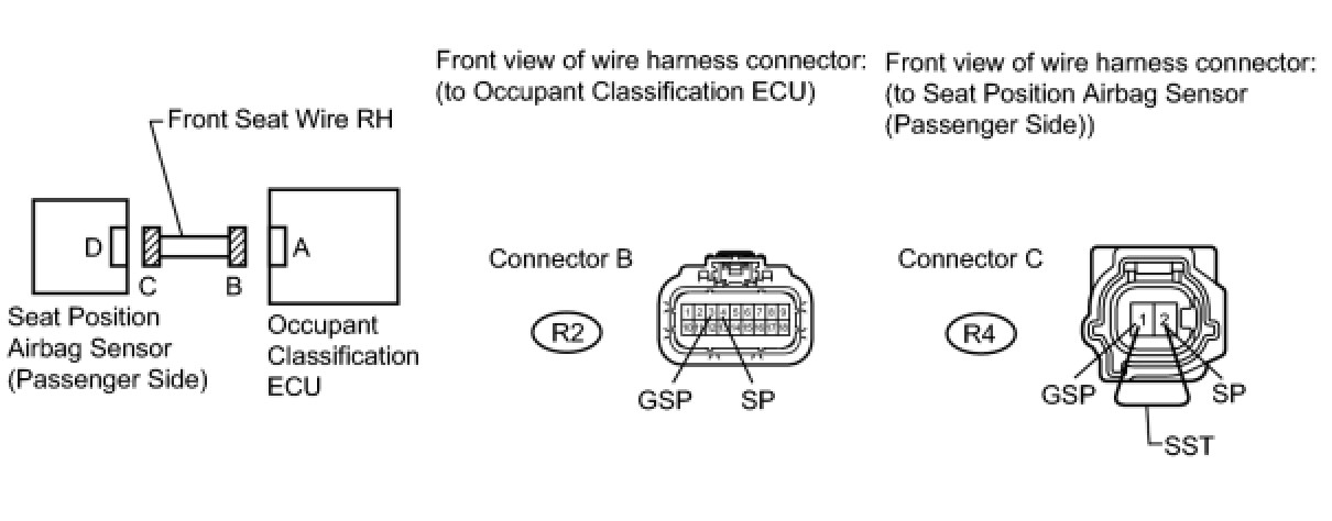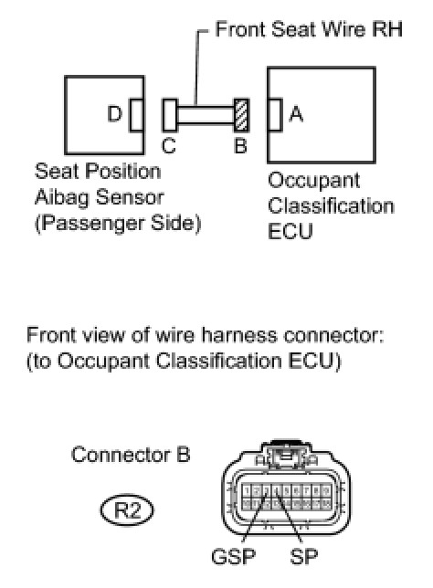 (c) Check that the connectors are properly connected to the occupant classification ECU and the seat position airbag sensor (passenger side).