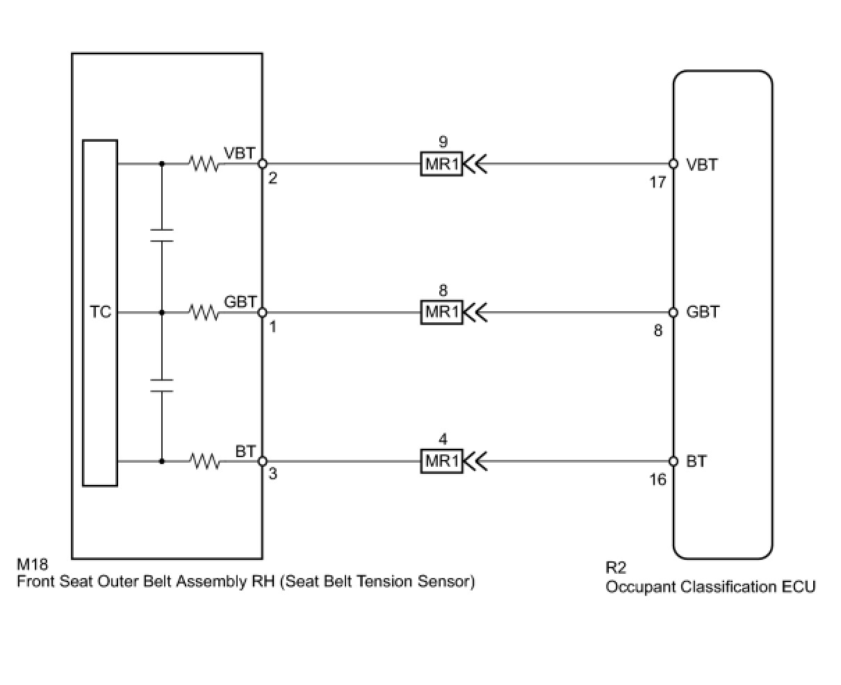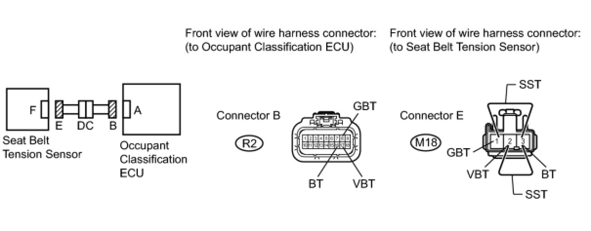 The seat belt tension sensor circuit consists of the occupant classification ECU and the seat belt tension sensor.