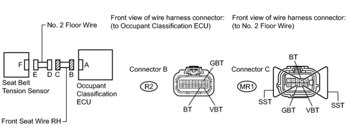 (c) Check that the connectors are properly connected to the occupant classification ECU and the seat belt tension sensor.