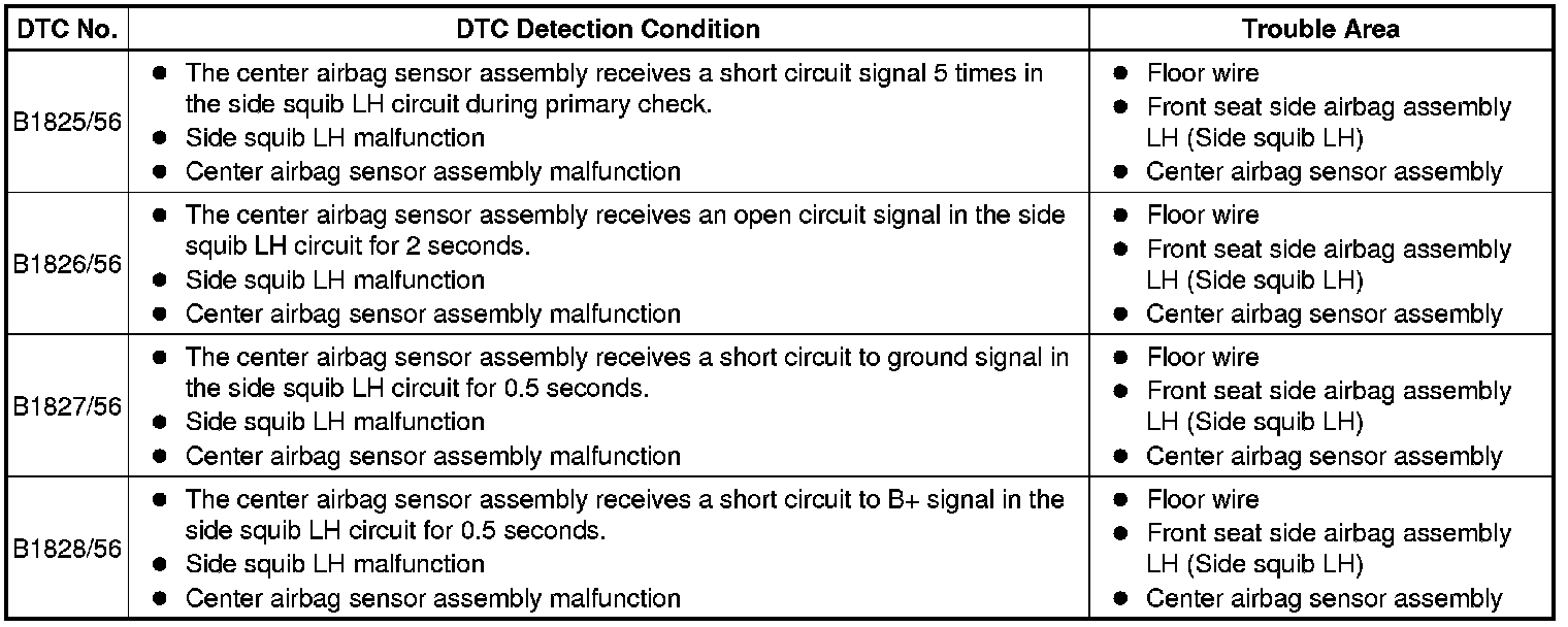 These DTCs are recorded when a malfunction is detected in the side squib LH circuit.