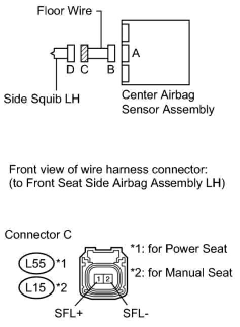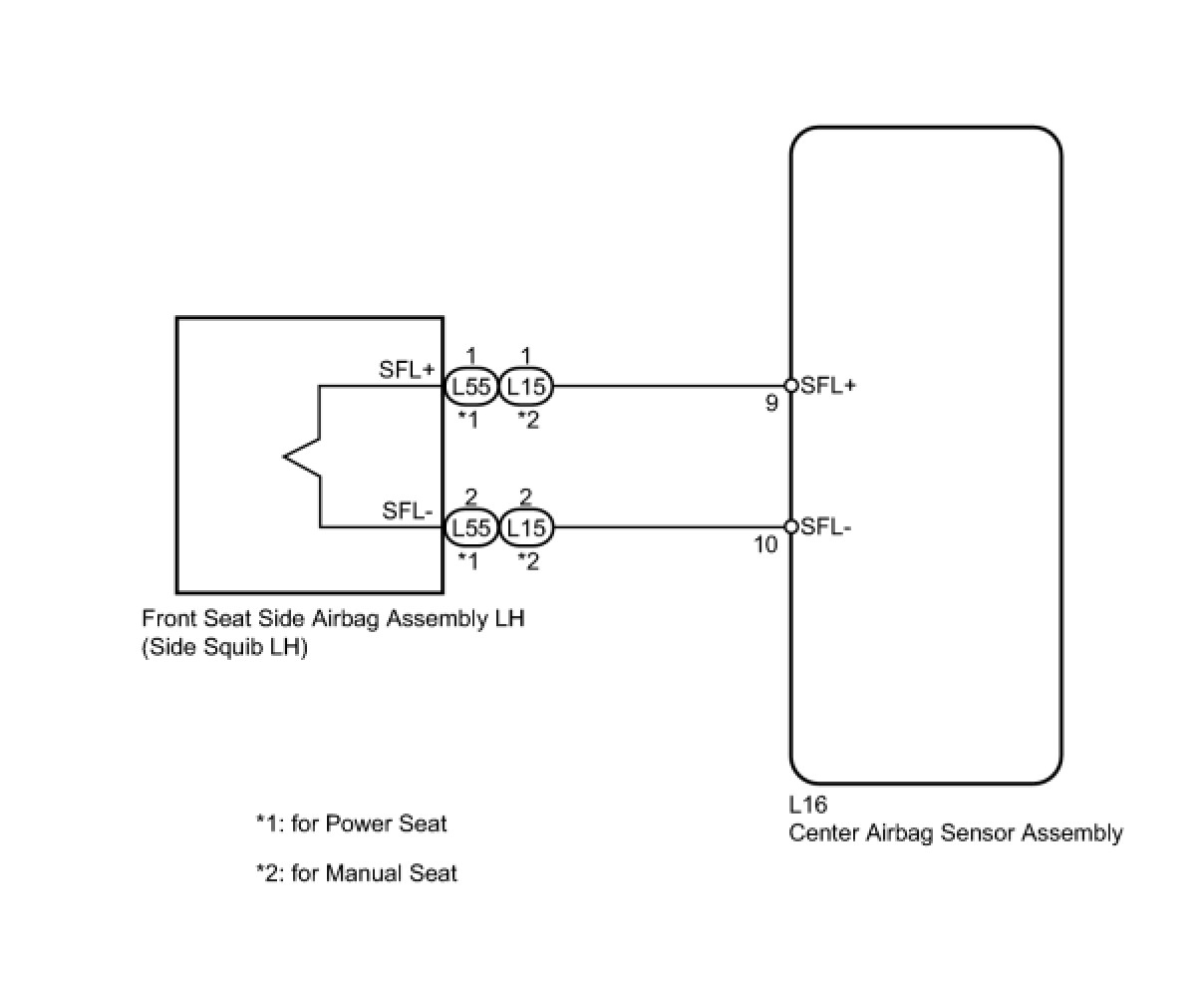 The side squib LH circuit consists of the center airbag sensor assembly and the front seat side airbag assembly LH.