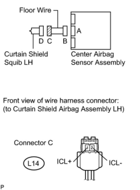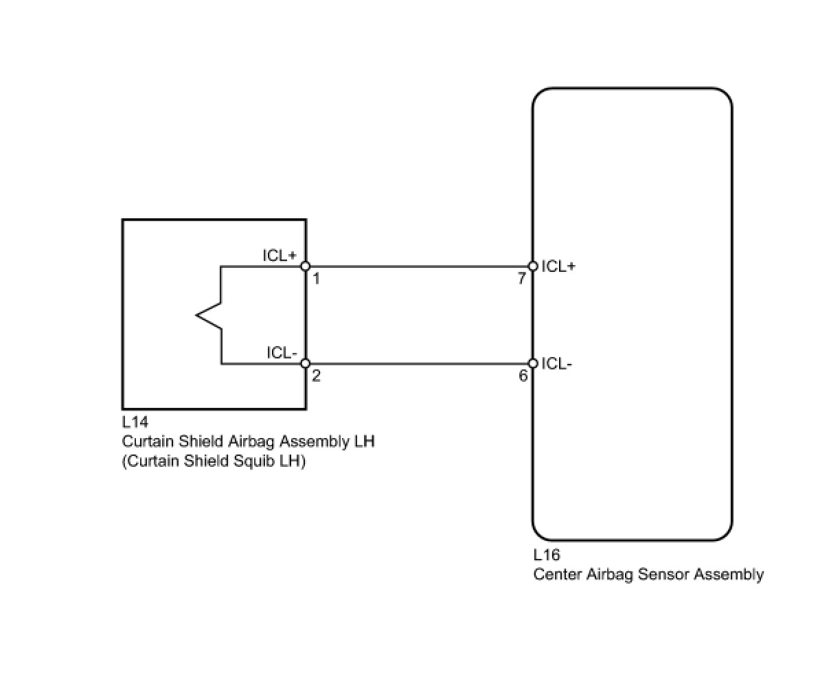 The curtain shield squib LH circuit consists of the center airbag sensor assembly and the curtain shield airbag assembly LH.
