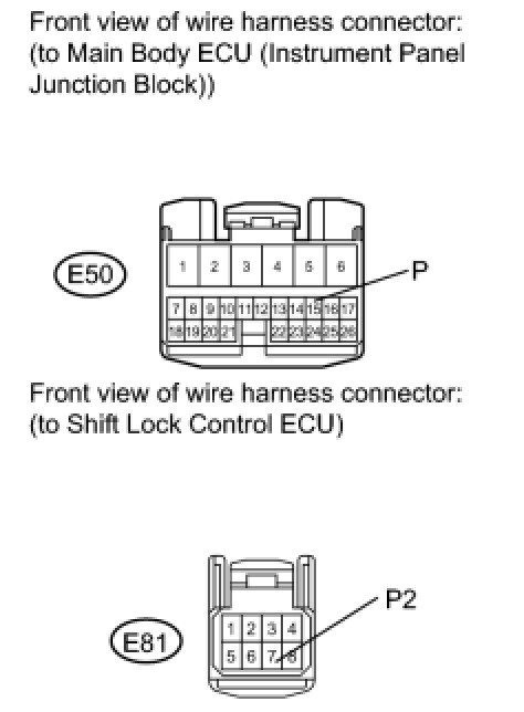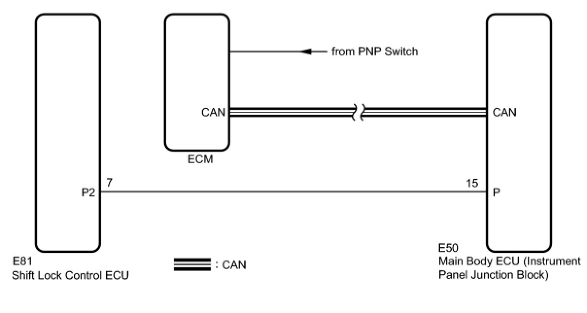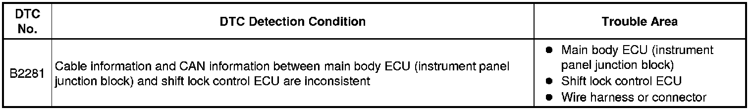 The ECM and the shift lock control ECU are connected by a cable and the CAN. If the cable information and CAN information are inconsistent, this DTC will be output.