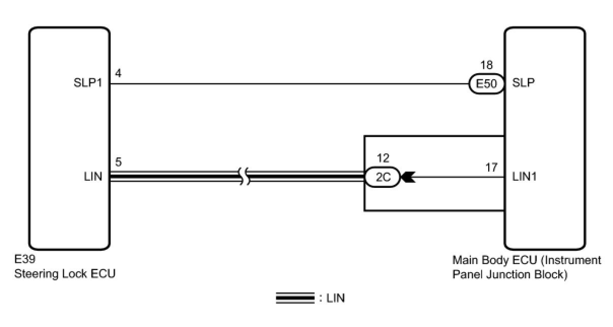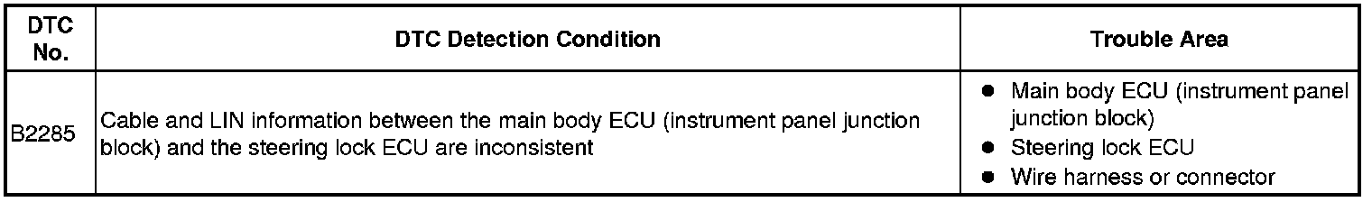 This DTC is output when serial communication signals and LIN communication signals in the circuit between the main body ECU (instrument panel junction block) and steering lock actuator (steering lock ECU) are inconsistent.