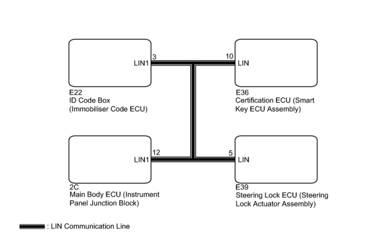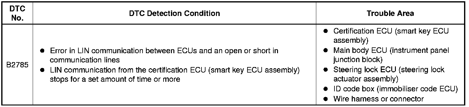 The certification ECU (smart key ECU assembly) monitors communication between all the ECUs connected to the certification ECU system LIN bus lines. When the certification ECU (smart key ECU assembly) detects an error in communication with all the ECUs connected to the certification ECU system LIN bus lines at a set interval and 3 times in a row, DTC B2785 will be output.