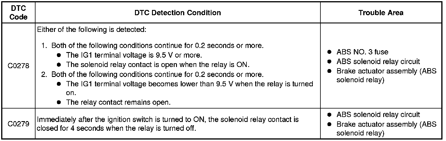 BRAKE CONTROL / DYNAMIC CONTROL SYSTEMS: VEHICLE STABILITY CONTROL SYSTEM: C0278, C0279: Open in ABS Solenoid Relay Circuit