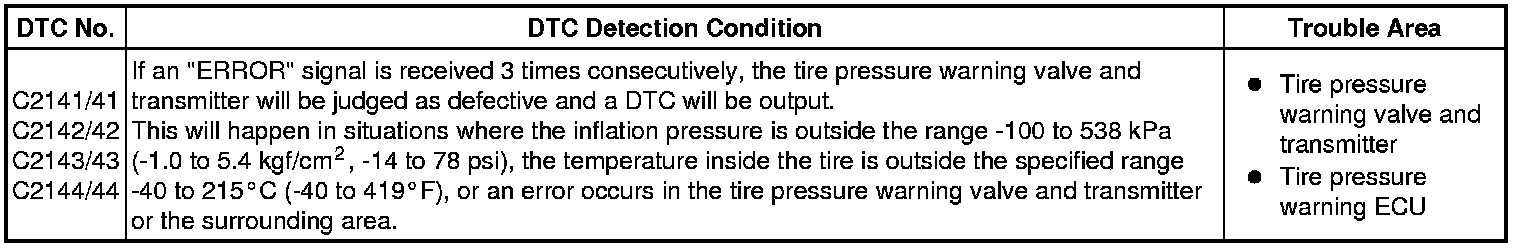 When the internal circuit of the tire pressure warning valve and transmitter is malfunctioning, one of these DTC is output.