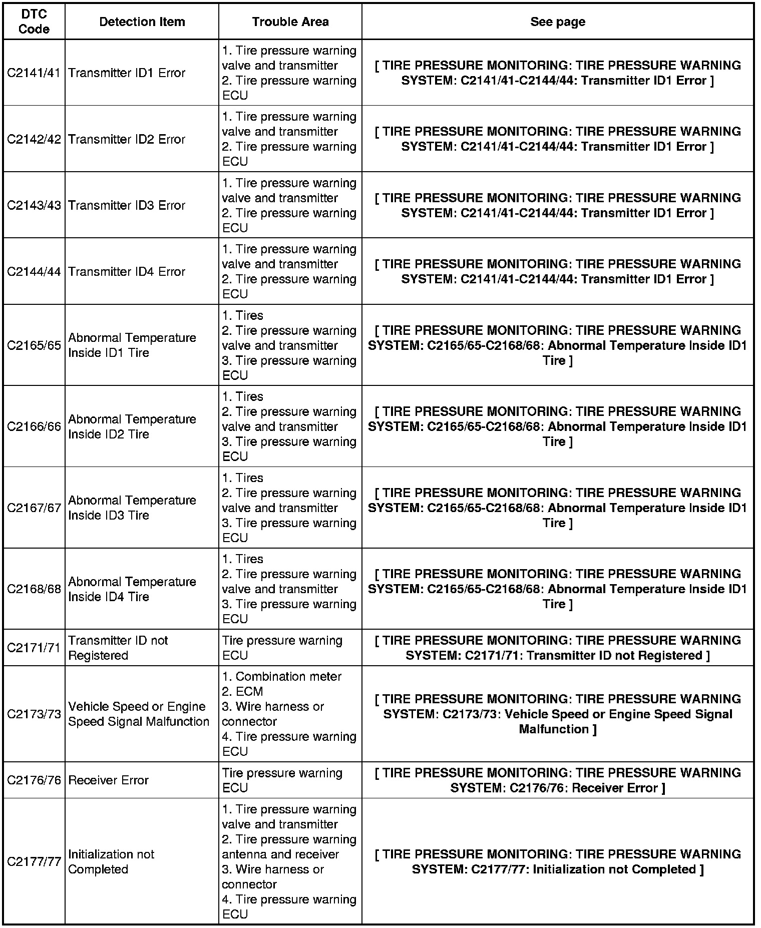 TIRE PRESSURE MONITORING: TIRE PRESSURE WARNING SYSTEM: DIAGNOSTIC TROUBLE CODE CHART