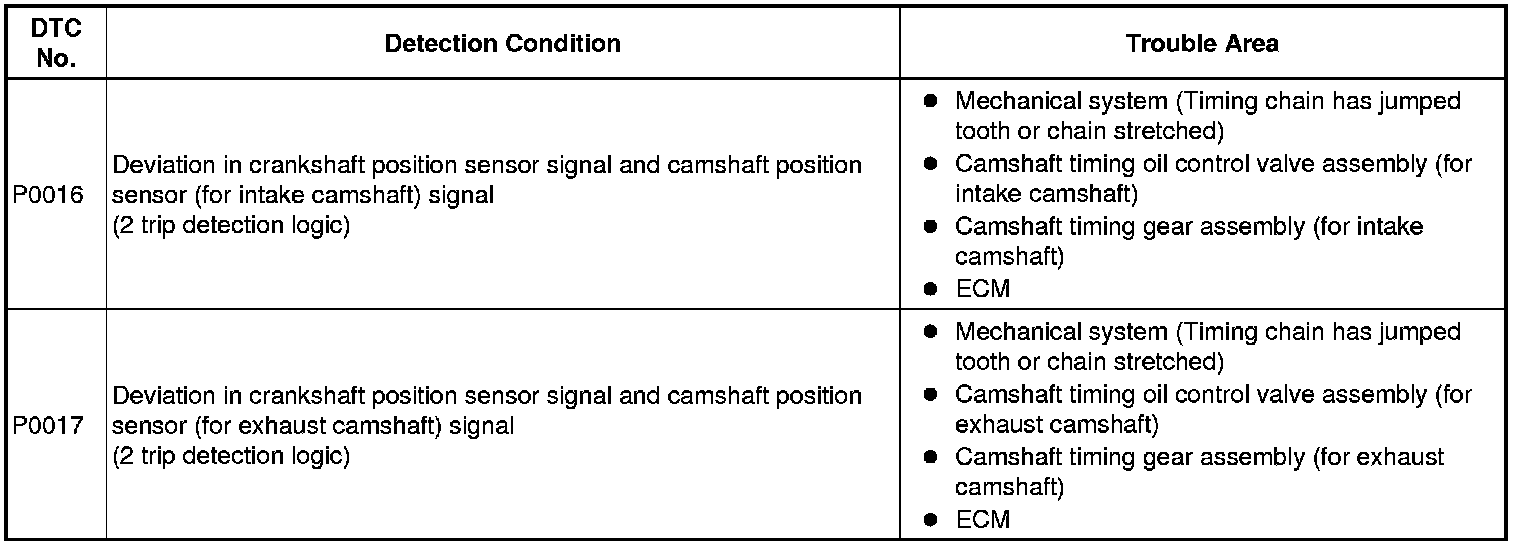 * The monitor for this DTC detects when the timing chain is shifted by one tooth or more.