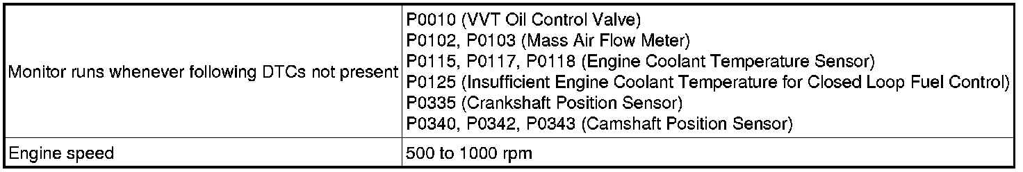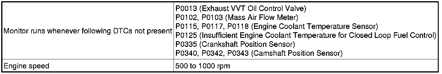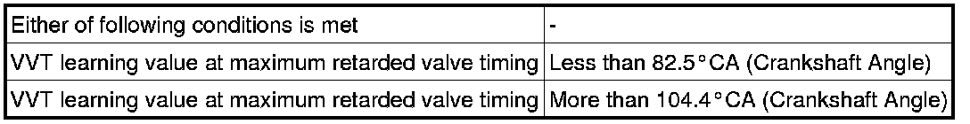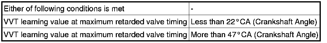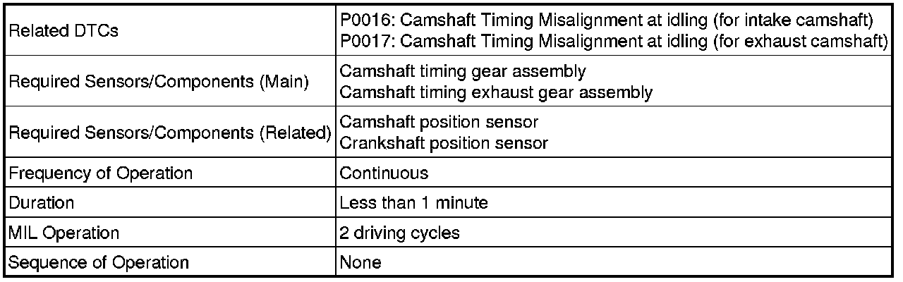 To monitor the correlation of the intake camshaft position and crankshaft position, the ECM checks the VVT learning value while the engine is idling. The VVT learning value is calibrated based on the camshaft position and crankshaft position. The intake valve timing is set to the most retarded angle while the engine is idling. If the VVT learning value is out of specified range in consecutive driving cycles, the ECM illuminates the MIL and sets the DTC P0016.