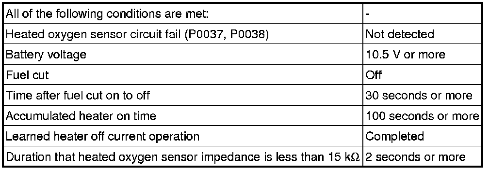 After the accumulated heater ON time exceeds 100 seconds, the ECM calculates the heater resistance using the battery voltage and the current applied to the heater. If the resistance is above the threshold value, the ECM will determine that there is a malfunction in the heated oxygen sensor heater and set DTC P0141.