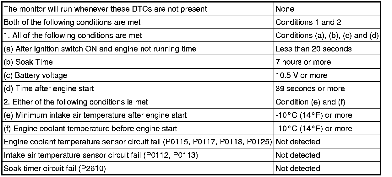 The ECM monitors the difference between the engine coolant temperature and the intake air temperature when the engine is started cold to detect the engine temperature conditions accurately. The monitor runs when the engine started cold after 7 hours or more has elapsed since the engine was stopped (ignition switch turned off) on the previous trip. If the difference between the engine coolant temperature and the intake air temperature on a cold start exceeds 20°C (36°F), the ECM interprets this as a malfunction in the engine coolant temperature sensor circuit and intake air temperature sensor circuit, and sets the DTC.