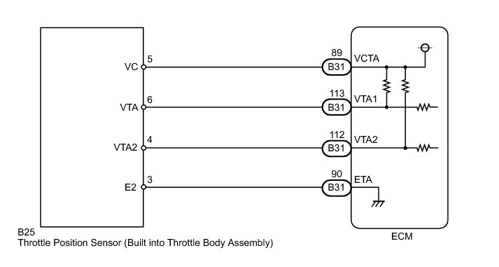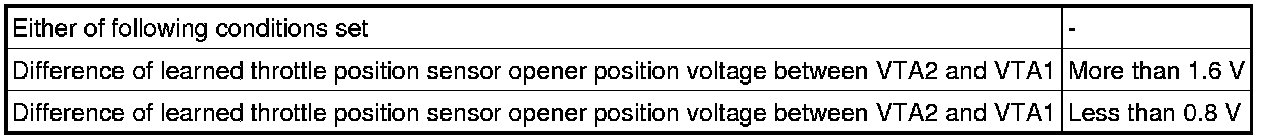 - A specific voltage difference is expected between the sensor terminals, VTA1 and VTA2, for each throttle valve opening angle. If the difference between VTA1 and VTA2 is incorrect, the ECM interprets this as a malfunction in the sensor circuit, and stores a DTC.