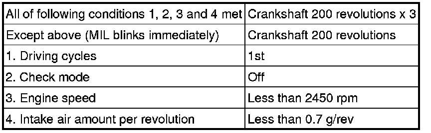 The ECM illuminates the MIL and sets a DTC when either one of the following conditions, which could cause emission deterioration, is detected (2 trip detection logic).