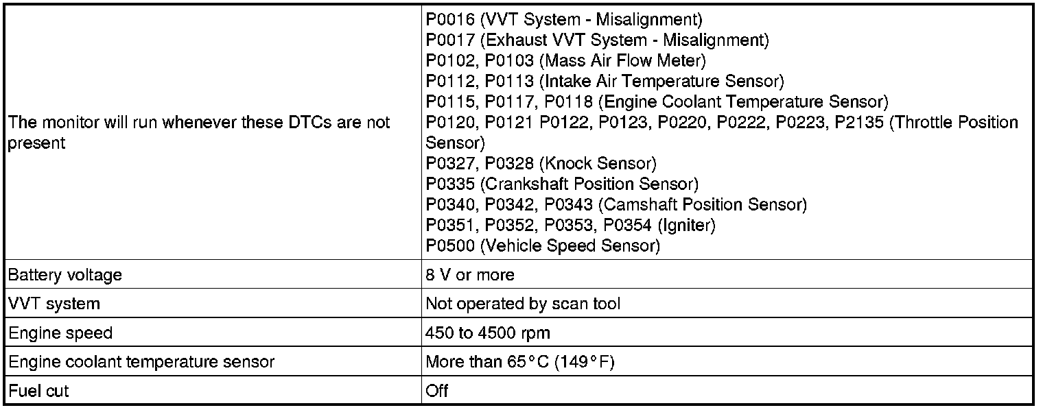 In order to store misfire DTCs, it is necessary to operate the vehicle for the period of time shown in the table below, confirm the Misfire RPM and Misfire Load in the Data List.