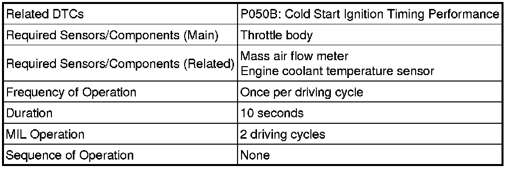 The DTC is designed to monitor the ignition timing at cold start. When the engine is started at an engine coolant temperature of below 50°C (122°F), the ECM checks the ignition timing during engine idling. If the ignition timing advances beyond the specified level within 10 seconds, the ECM interprets this as a malfunction. The MIL is illuminated and a DTC is stored when the malfunction is detected in consecutive driving cycles (2 trip detection logic).