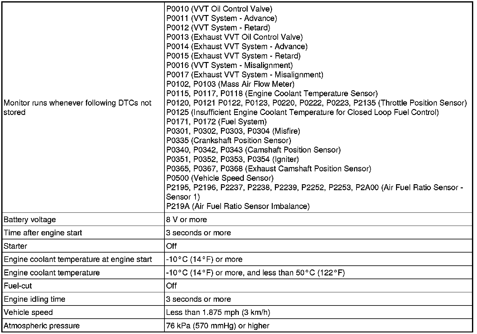This monitor will run when the engine is started at an engine coolant temperature of -10 to 50°C (14 to 122°F). The DTC is stored after the engine idles for 13 seconds (2 trip detection logic).