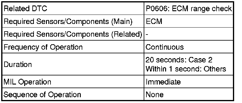 The ECM continuously monitors its main CPU. This self-check ensures that the ECM is functioning properly. If outputs from the CPU is deviate from the standard, the ECM will illuminate the MIL and set the DTC immediately.