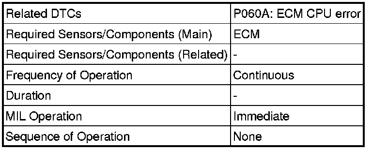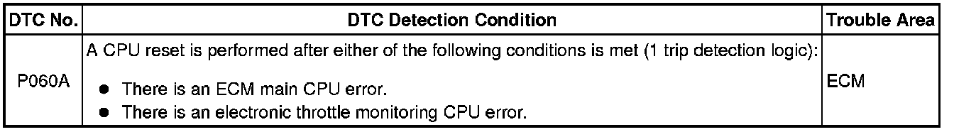 The main CPU and electrical throttle monitoring CPU of the ECM communicate with between each other. The main CPU monitors the communications and WDC pulses from the electrical throttle monitoring CPU. When the signal malfunctions below deviate, the DTC is stored.