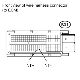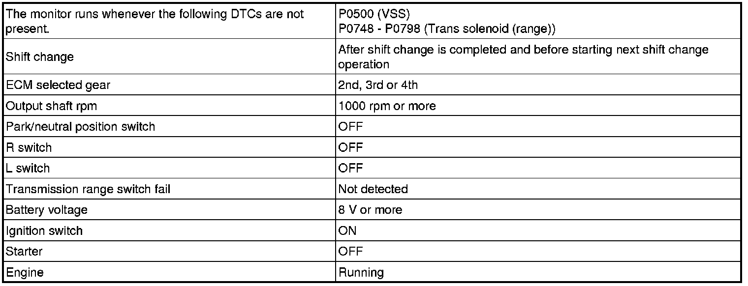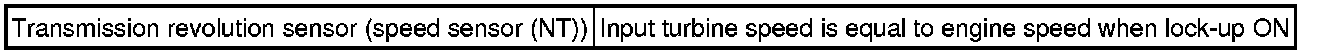 When the output shaft speed is higher than the expected value and the input shaft speed is 300 rpm or less while running with the shift in the D position, the ECM will conclude that there is malfunction of the input turbine speed sensor (NT). The ECM will illuminate the MIL.