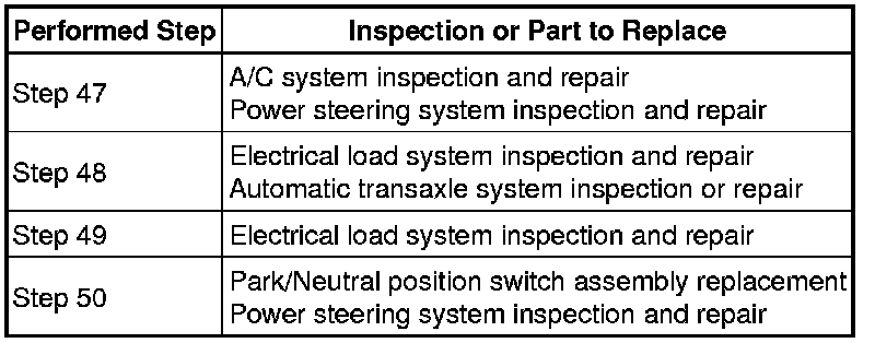 * Even if the results are normal, the electrical load signal system and/or the automatic transaxle system may have been malfunctioning. Continue this inspection procedure until step 50, and if there are no problems with other parts, inspect the electrical load system and/or the automatic transaxle system (refer to step 58).