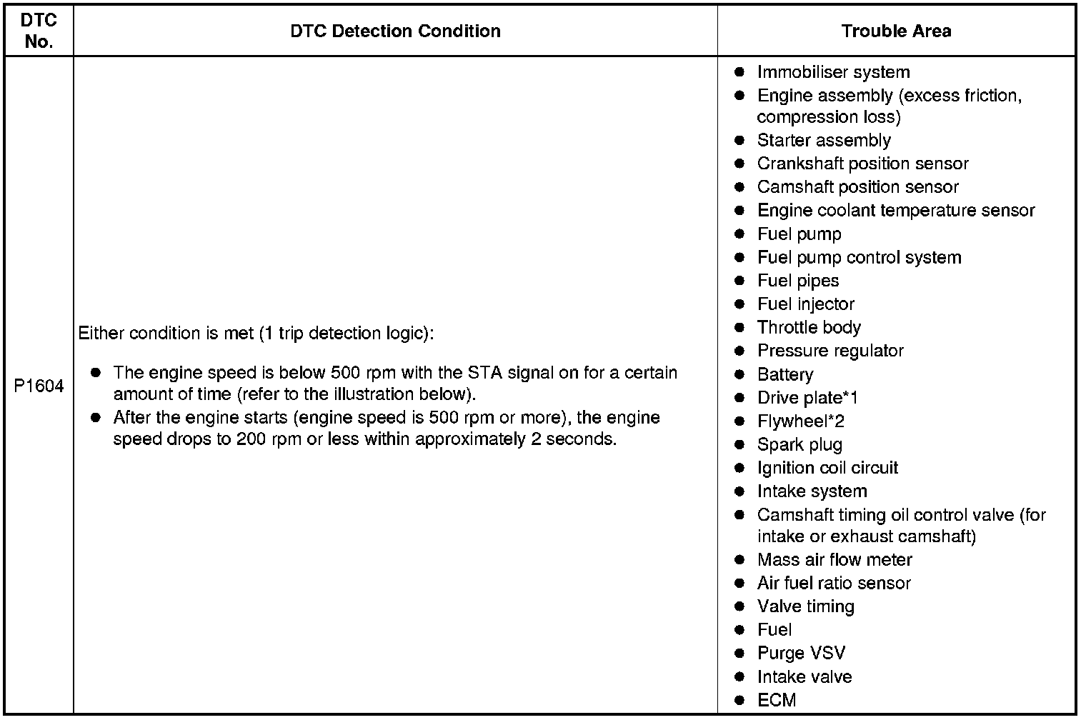 This DTC is stored when the engine does not start even though the STA signal is input or when the engine takes a long time to start, and when the engine speed is low or the engine stalls just after the engine starts.