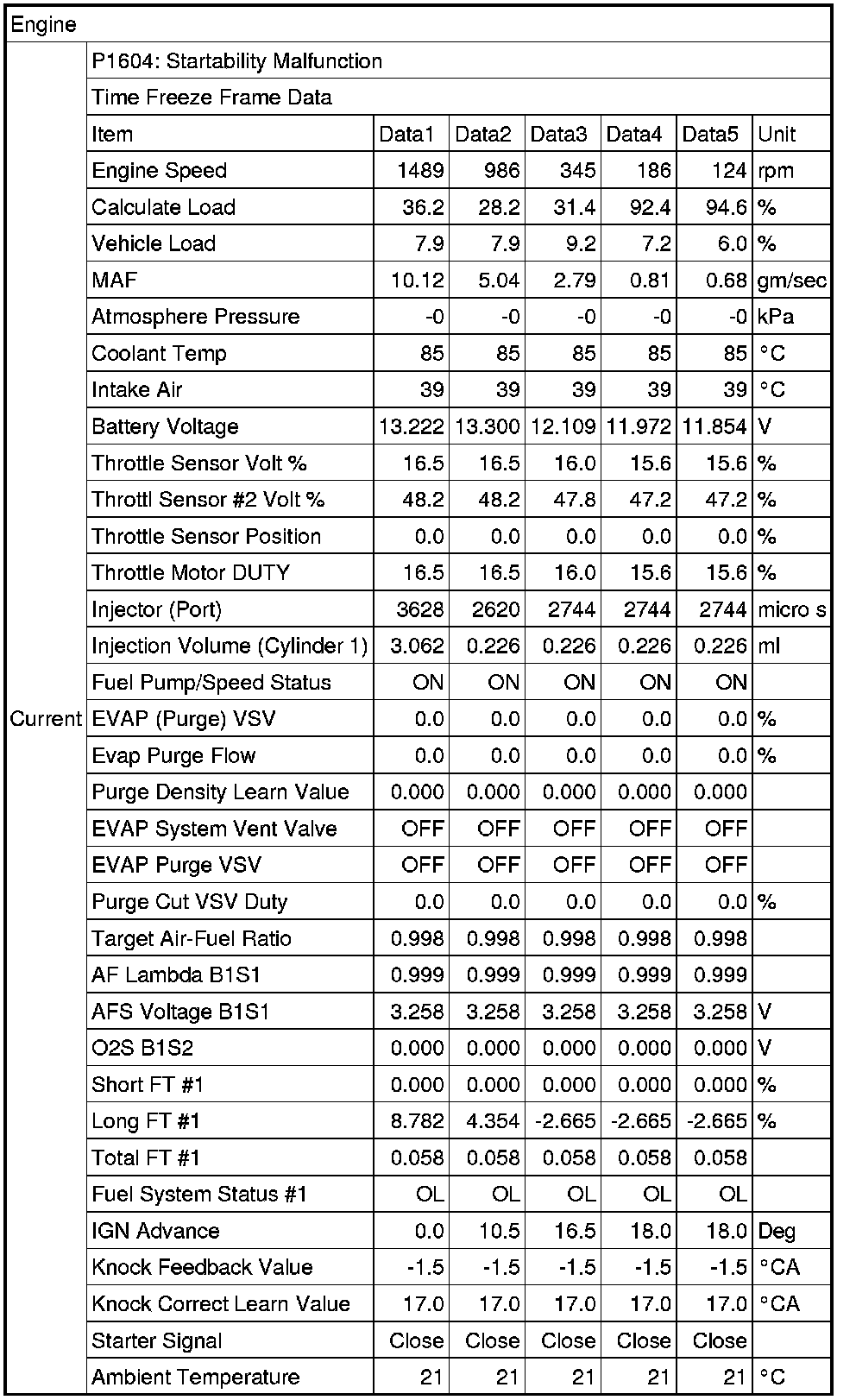Freeze Frame Data P1604 Startability Malfunction