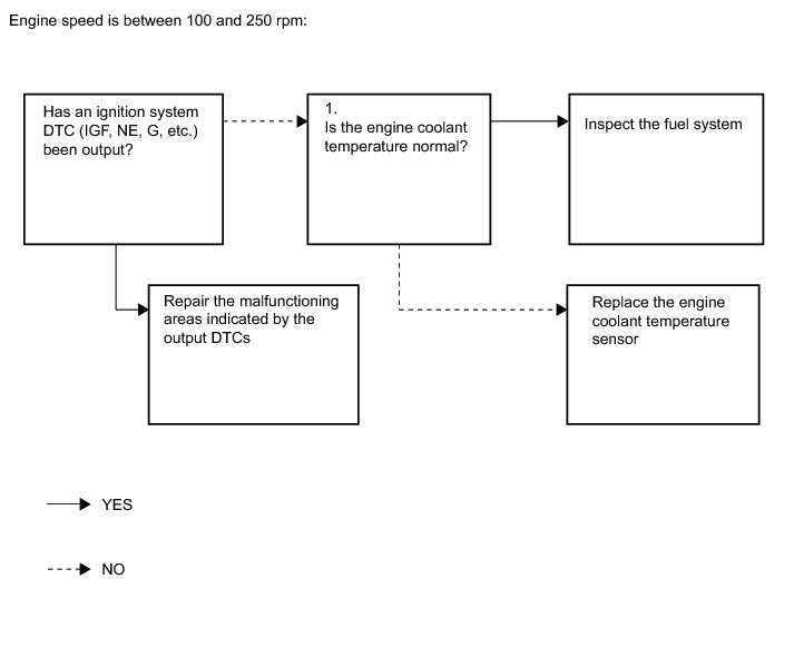 If the engine speed is 250 rpm or higher (combustion occurs but the initial combustion and starter turnoff timing is too late), the fuel injection volume is often incorrect (too low or too high) and determining the cause of the malfunction is often difficult.